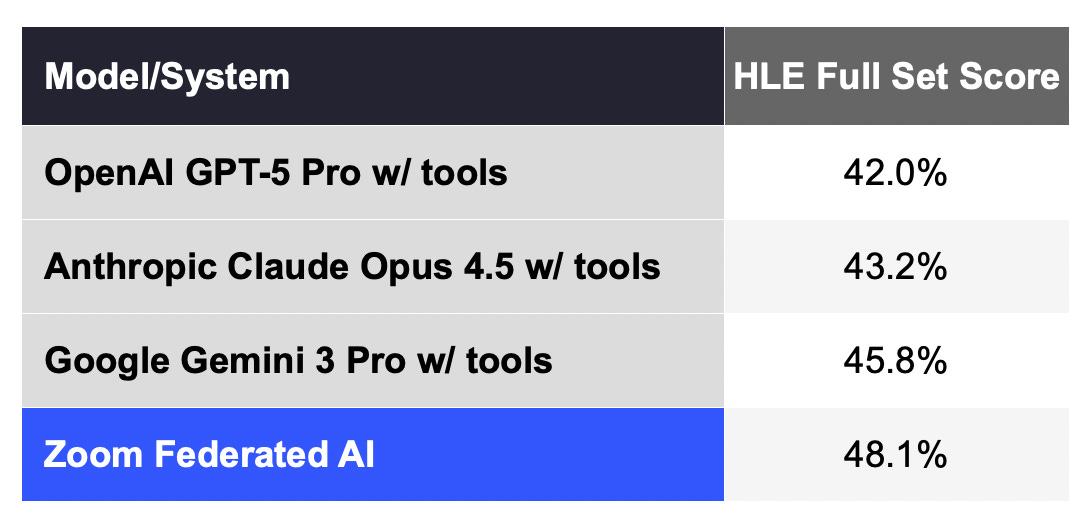 News: While the infrastructure war hits financial bottlenecks, the war for model dominance continues at the application layer. Zoom just shocked the industry by announcing that its ‘federated’ AI system scored 48.1% on “Humanity’s Last Exam.” This result puts the communication giant ahead of several frontier models on one of the most grueling expert-level reasoning tests currently available.