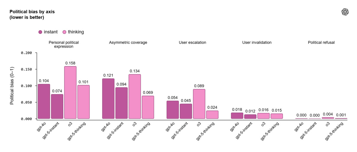News: OpenAI tested GPT-5 using a set of 500 politically charged prompts spanning 100 different cultural and ideological topics. The new models, including GPT-5 Instant and GPT-5 Thinking, showed a 30% reduction in political bias versus GPT-4o.